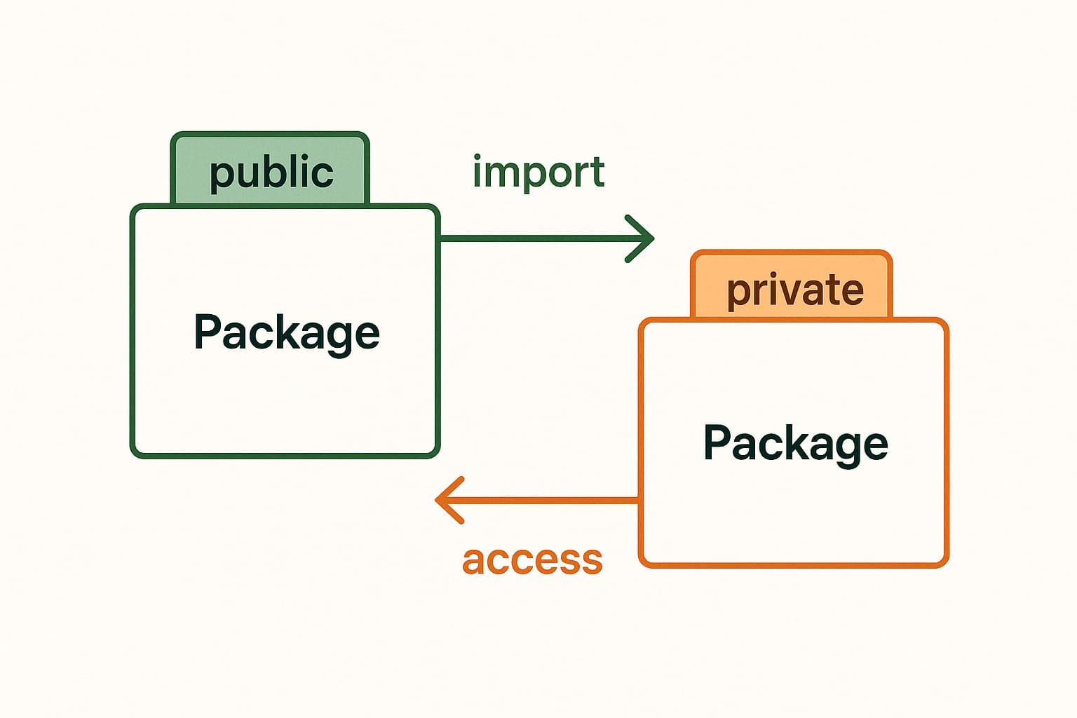 | Notation | Dashed arrow with the `<<import>>` keyword | Dashed arrow with the `<<access>>` keyword |